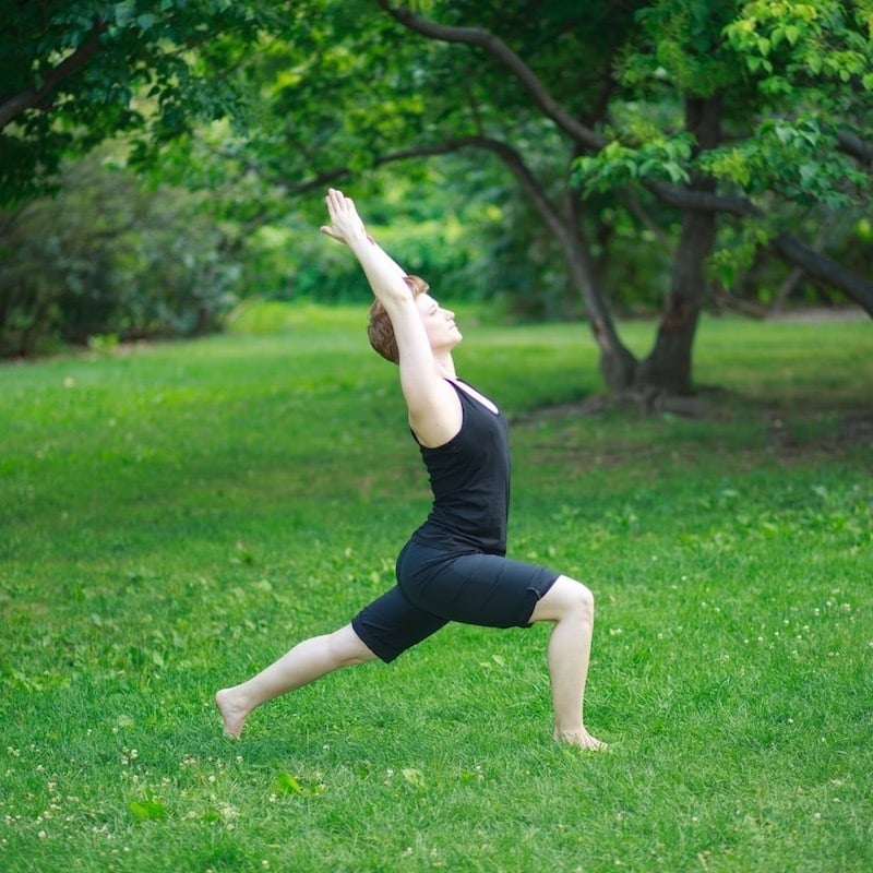 Poses included: low lunge, revolved low lunge, high lunge, warrior 2.